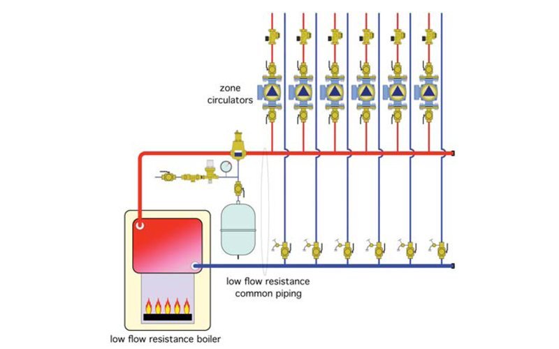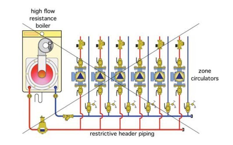 امروزه، سیستمهای گرمایشی فراوانی از بویلرهای کم حجم به عنوان منبع گرمایشی خود استفاده مینمایند. این نوع بویلرها، مقاومت بسیار بالاتری را در مقایسه با بویلرهای متداول از خود بروز میدهند. چنانچه چنین بویلری بدون در نظر گرفتن تمهیدات لازم جایگزین یک بویلر با مقاومت پایین در مقابل جریان در سیستمی همانند مجموعه شکل بالا مورد استفاده قرار گیرند، مشکلاتی را به همراه خواهند داشت. در نتیجه میتواند شبیه شکل زیر باشد که البته بکارگیری این آرایش به هیچ وجه توصیه نمیشود. مهمترین شکل احتمالی، تداخل میان پمپهای مدارهایی است که به طور همزمان مورد استفاده قرار میگیرند.