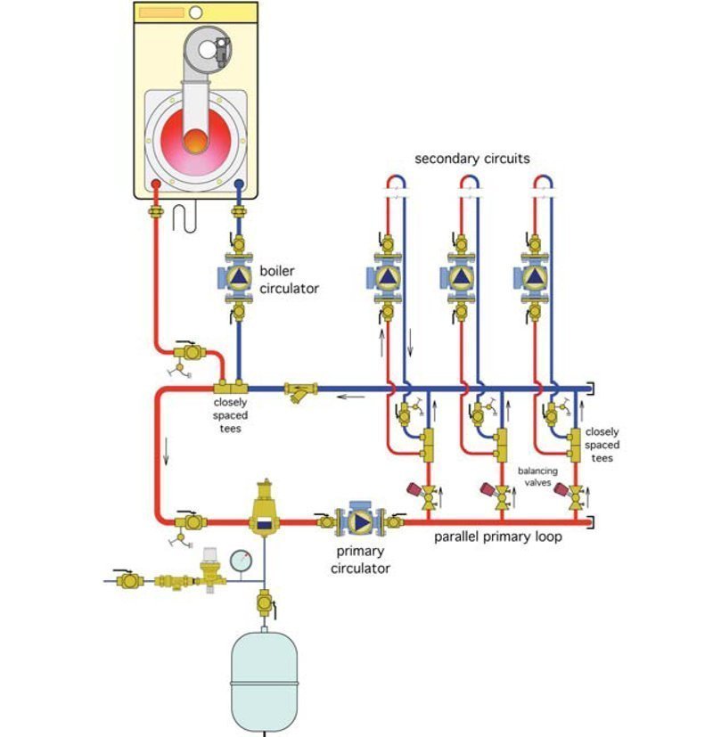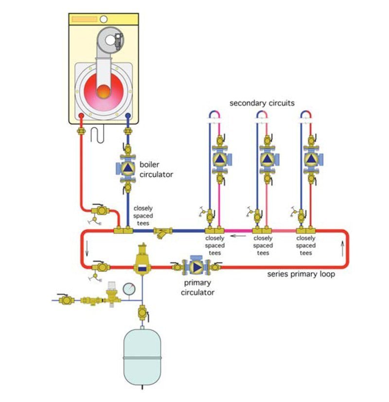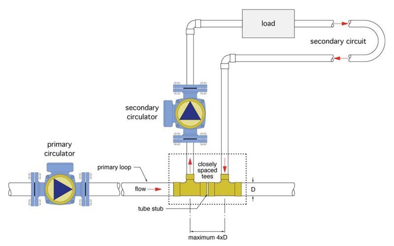 در این حالت، اصلاحاً گفته میشود که مدارهای اولیه و ثانویه از نظر هیدرولیکی از یکدیگر جدا شده اند. جریان تنها زمانی در مدار ثانویه ایجاد خواهد شد که پمپ آن بکار افتد. این ایده را میتوان به سیستمی با چند مدار ثانویه که انرژی همگی توسط یک مدار اولیه تأمین میشود، تعمیم داد. هر مدار ثانویه، شامل مدار ثانویه بویلر، توسط یک جفت سه راهی که فاصله بسیار کمی با یکدیگر دارند به مدار اولیه متصل میشود.