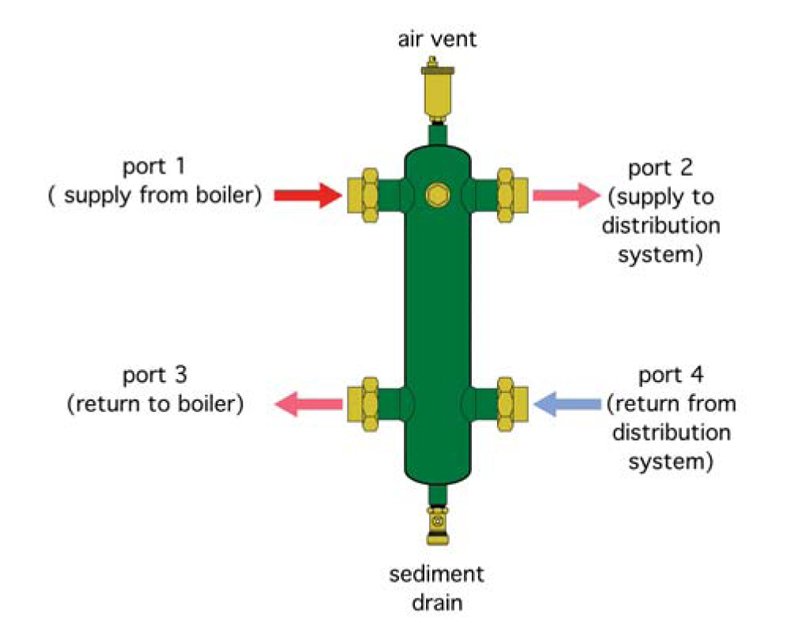 تمامی مزیتهای فوق را میتوان با پیچیدگی بسیار کمتر در قالب یک هیدرولیک سپراتور به مدارهای گرمایشی اضافه نمود. شکل زیر، طرح کلی یک هیدرولیک سپراتور نوعی را نشان میدهد.